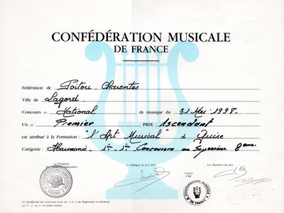 Diplôme décerné à l'Art Musical de Guise lors du Concours National de Musique de La Rochelle - Lagord